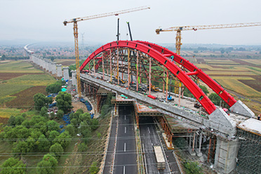 内蒙集大铁路丰镇特大桥钢管拱桥工程位于内蒙古丰镇市,总长144米,横跨二广高速公路,桥面宽18.5米,钢管拱部最高达48.12米,拱肋外观整体内倾8,形似提篮式。 -