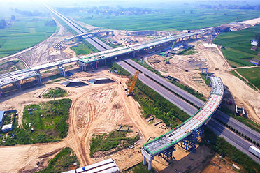 兰考至太康段傅集枢纽互通钢箱梁工程用钢量约4200吨,采用步履式顶推施工。 -